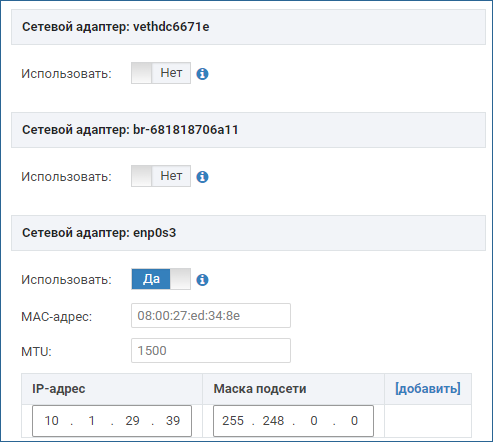 | Сетевой шлюз | IP-адрес шлюза (gateway) | Заданные в процессе установки операционной системы параметры вычитываются из файла /etc/network/interfaces. После изменения значений в данной форме, данные в файле обновляются. |