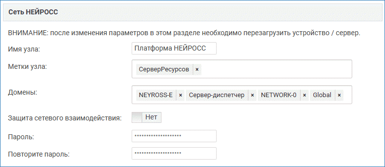 Блок Сеть НЕЙРОСС раздела Подключение к сети предназначен для задания параметров идентификации узла в сети НЕЙРОСС. Если какой-либо узел НЕЙРОСС «не виден» в списке узлов, он может принадлежать другому домену. Для защиты сетевого взаимодействия в незащищенной сети, включите режим авторизации по паролю.