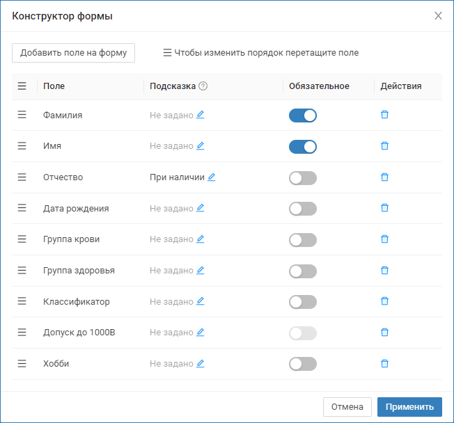 - задать признак обязательности — указать перечень полей, обязательных к заполнению;