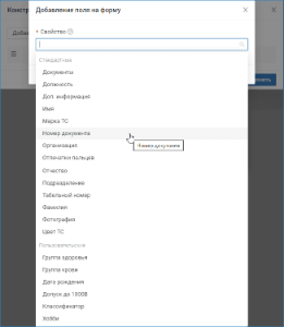 - добавить произвольный набор полей на форму — поля добавляются последовательно, по одному, путем выбора из списка;
