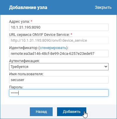 | Адрес узла | Введите адрес в формате: [ip-адрес сервера SecurOS]:[порт] Введите порт, указанный в поле Порт на этапе [Настройка ONVIF-сервера]. Например: 10.1.31.195:8090 |