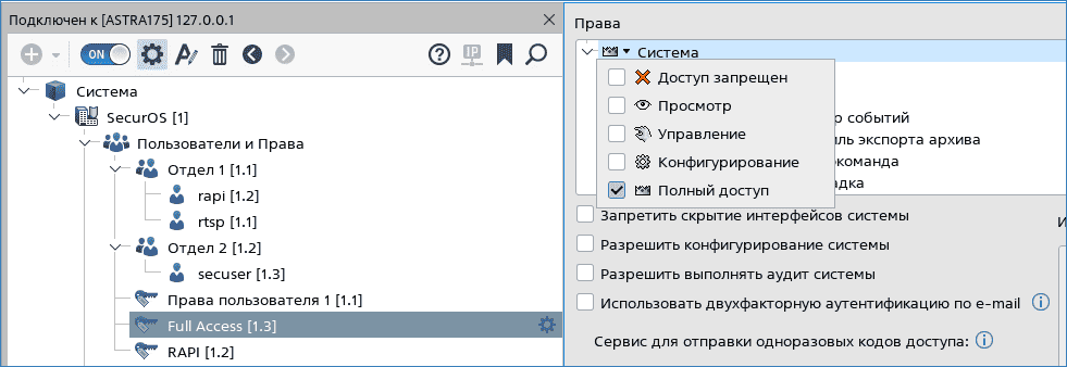 Права пользователя настраиваются в соответствии с инструкцией производителя. Для удобства вы можете задать полный доступ к системе.