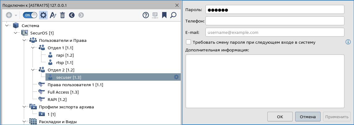 Добавьте учетную запись пользователя, под именем которого будут выполняться команды камерам SecurOS из Платформы НЕЙРОСС. Эти данные будут указываться на сервере Платформы НЕЙРОСС при подключении видеосервера.
