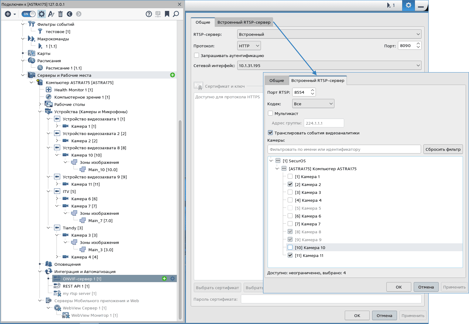 На вкладке Встроенный RTSP-сервер выберите камеры, которые должны быть доступны на Платформе НЕЙРОСС. Сохраните изменения.