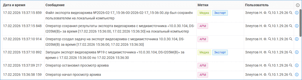 С версии 20.43 Платформы НЕЙРОСС для добавления метки в фильтр Системного журнала достаточно просто кликнуть по соответствующей метке произвольного события. С версии 20.45 добавлен поиск записей по определенному владельцу или пропуску: можно отслеживать изменения данных операторами Бюро пропусков. С версии 20.46 добавлена возможность отслеживания подключений к медиаисточнику по IP-адресу компьютера-клиента.