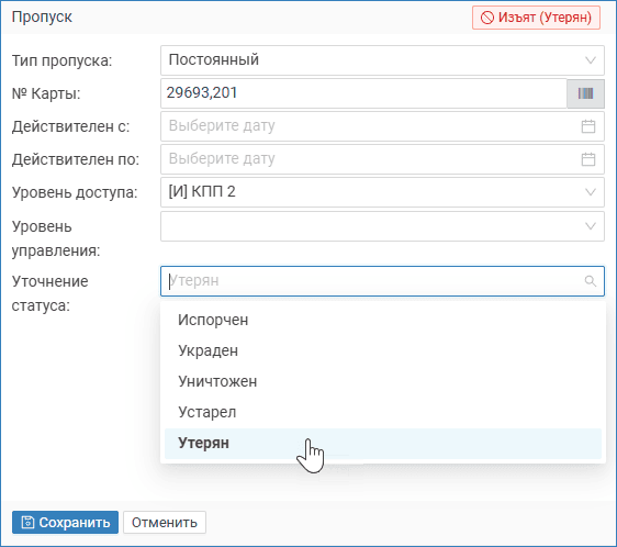 Статус пропуска и его уточнение указывается непосредственно в форме пропуска, например, — Приостановлен (Отгул), Изъят (Утерян). Также поле Уточнение статуса может быть добавлено в таблицу пропусков. Доступна сортировка и поиск по значению уточнения.