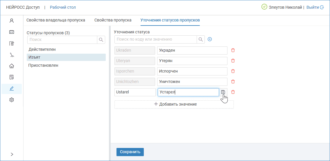 | Изъят | Пропуск удалён из сети НЕЙРОСС либо сдан в бюро пропусков (оператор выполнил команду изъятия пропуска). |