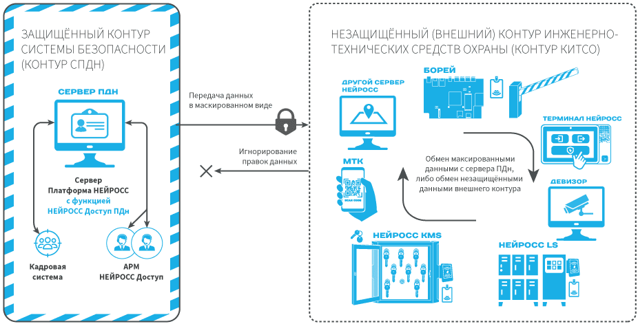 - Контур СПДн — сервер НЕЙРОСС, интегрированный с кадровой системой, рабочие места операторов бюро пропусков;