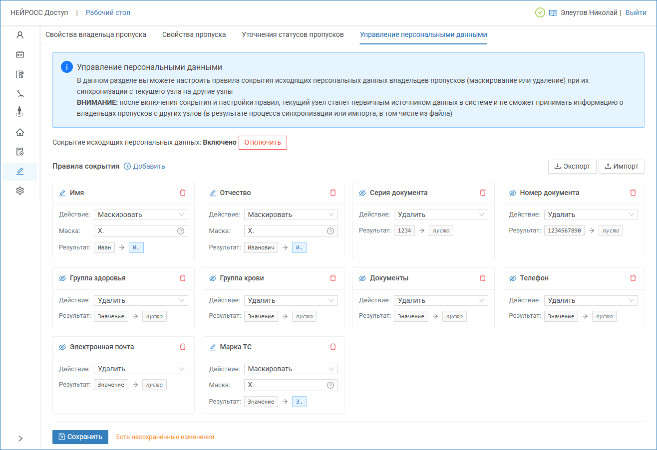 При размещении этих устройств в незащищённом контуре с ненулевой возможностью компрометации данных, настоятельно рекомендуем воспользоваться функцией сокрытия персональных данных НЕЙРОСС Доступ ПДн.