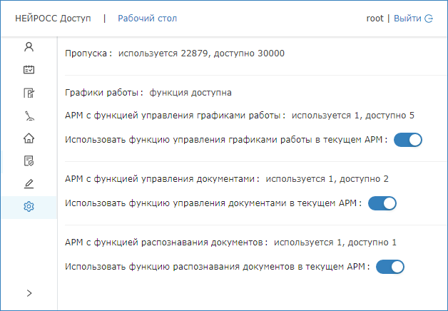 Активируйте лицензии на управление документами и на распознавание документов на данном АРМ, для этого в АРМ НЕЙРОСС Доступ перейдите к разделу Настройки АРМ и включите функции АРМ с функцией управления документами, АРМ с функцией распознавания документов.