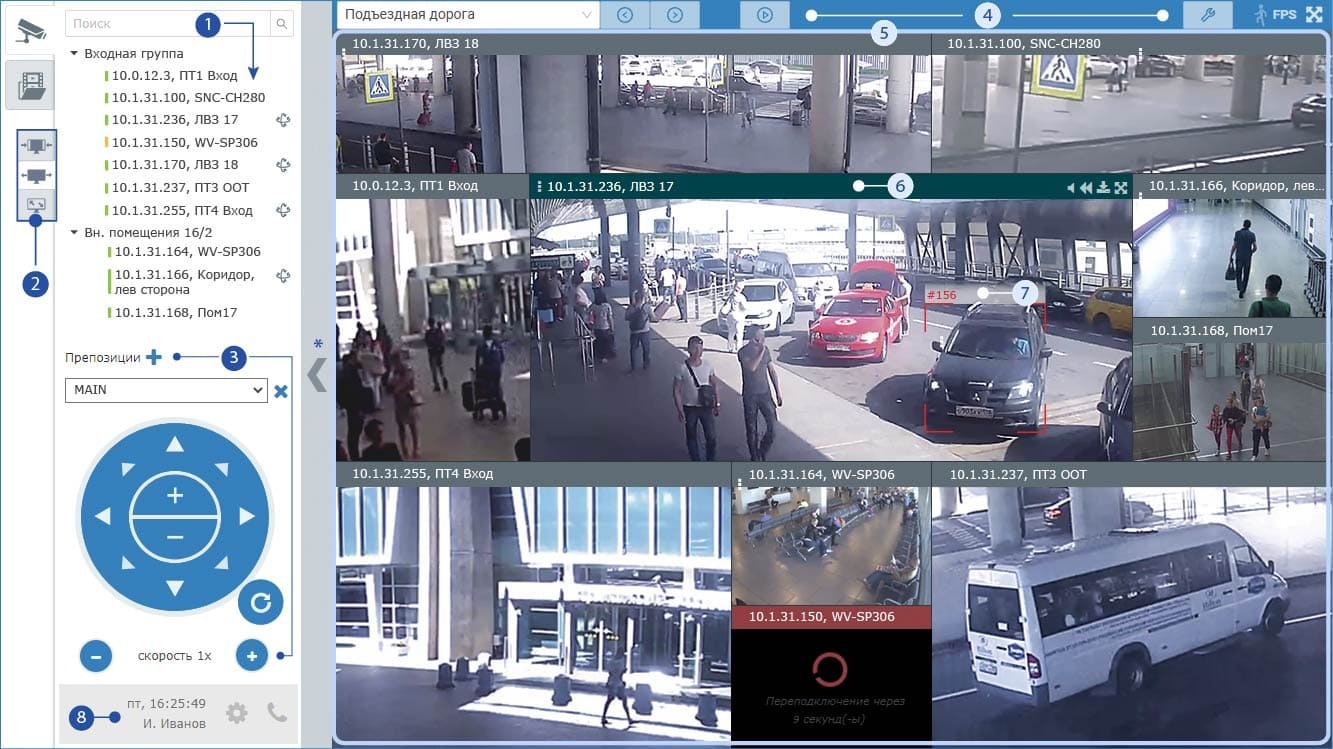 Выберите окно видеоизображения с поворотной камеры, для этого щелкните левой клавишей мыши в области видеоизображения или в заголовке окна [6]. Вы также можете открыть видео с поворотной камеры в произвольной ячейке мультиэкрана, выбрав её в списке медиаисточников [1].
