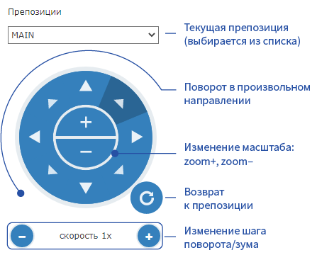 Видео отображается полностью. При несовпадении пропорций, производится сжатие/растяжение видеопотока по ширине и высоте ячейки.- Виртуальный джойстик: обеспечивает переключение между препозициями, масштабирование (зум, zoom) изображения, поворот объектива камеры и возврат к предустановленной позиции, доступно изменение скорости управления (размера шага); по умолчанию скрыт, для использования необходимо разрешение на управление PTZ-камерой;