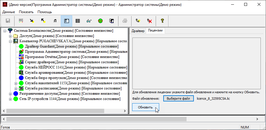 - В поле Файл обновления укажите путь к файлу лицензии. Нажмите на кнопку Обновить.