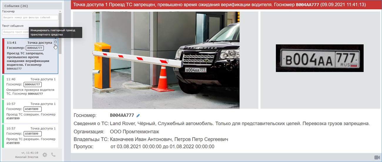Если алгоритм проезда был нарушен: истекло время ожидания предъявления пропуска водителя, истекло время ожидания подтверждения оператора, — оператору предоставляется возможность повторно инициировать алгоритм проезда без необходимости отъезда и повторного проезда ТС или повторного предъявления транспортного пропуска.