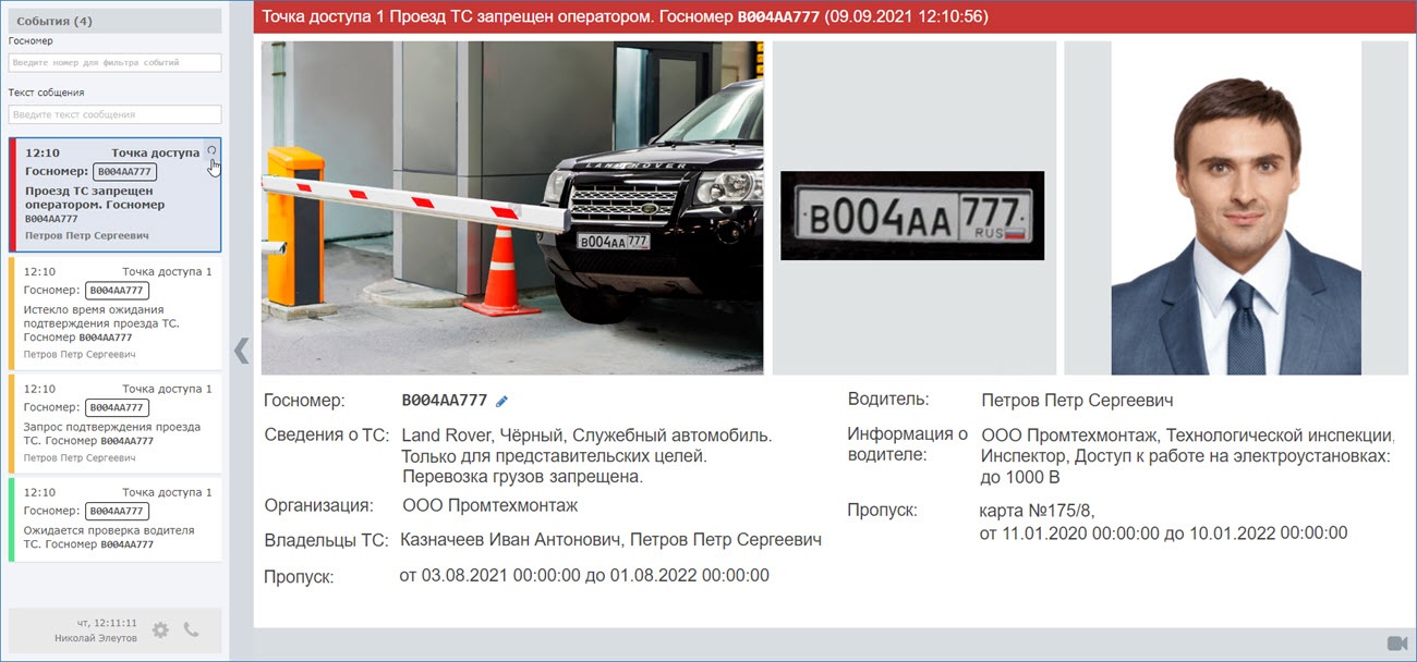 - Система распознавания по факту «захвата» изображения пластины госномера распознаёт номер транспортного средства, ЛИБО водитель предъявляет пропуск транспортного средства. Система находит по госномеру или по идентификатору пропуск транспортного средства и выводит его данные. Если пропуск не найден, неавторизован, имеет неверный тип, выводятся соответствующие сообщения [Сообщения системы], формируется запрет доступа. При ошибке распознавания госномера воспользуйтесь инструкцией из подраздела [Ошибка распознавания]. Если пропуск валиден, в зависимости от того, требуется ли проверка водителя или подтверждение оператора, принимается решение о разрешении доступа или переходу к следующему шагу (шагу 2 или 3 соответственно).