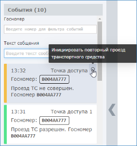 - В ленте событий [1] в карточке события нажмите на кнопку Инициировать повторный проезд транспортного средства.