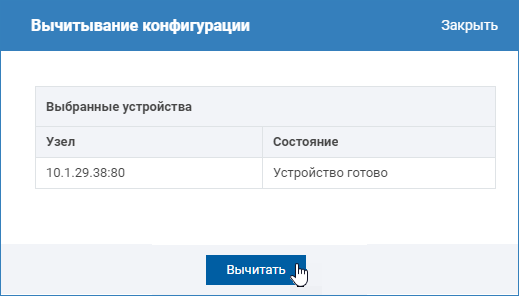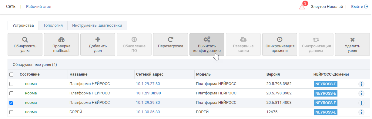- Выберите локальный узел Платформа НЕЙРОСС, с которого требуется вычитать планы (вы можете выделить сразу несколько узлов) и нажмите на кнопку Вычитать конфигурацию.
