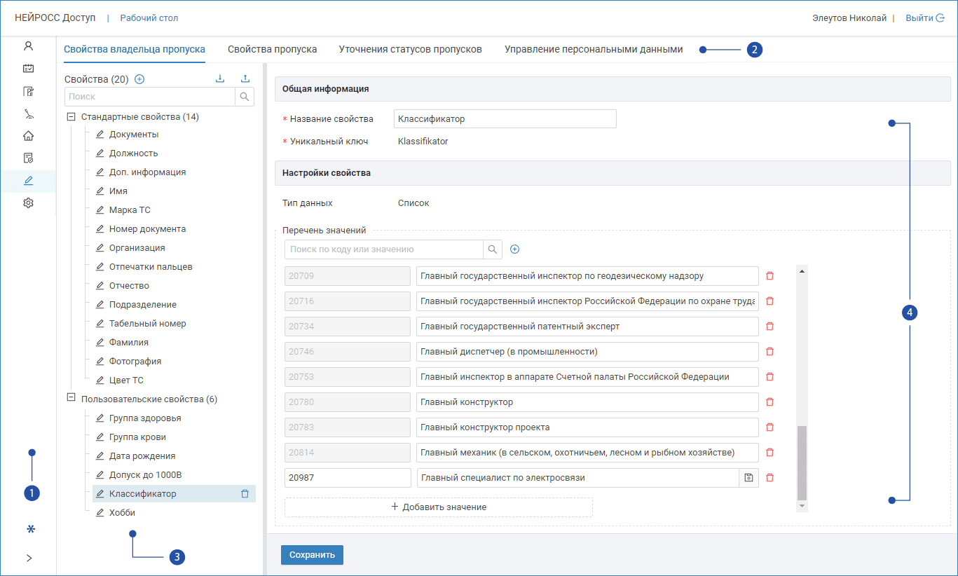 - Список свойств: список стандартных и пользовательских свойств пропуска или владельца (в зависимости от выбранной вкладки [2]);