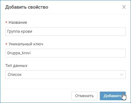 Для добавления свойства нажмите на кнопку Добавить новое свойство в блоке Свойства.