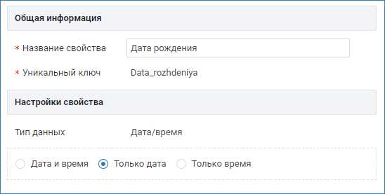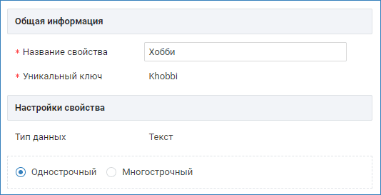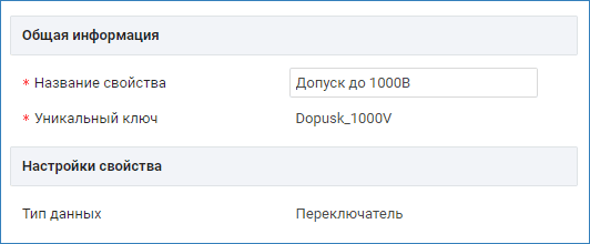 - Настройки свойства: стандартные свойства не редактируются, но по уникальному ключу свойства вы можете настроить нестандартное поведение; перечень настроек пользовательского свойства зависит от его типа.