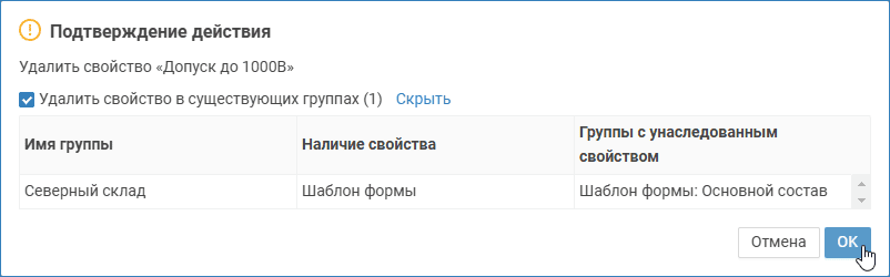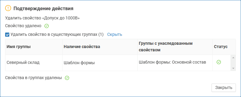 При удалении свойства или одного из значений свойства оно удаляется из форм ввода, созданных при помощи конструктора. При этом учитывается и наследование шаблонов форм дочерними группами пропусков. Выводится соответствующее уведомление и перечень «затронутых» групп пропусков.