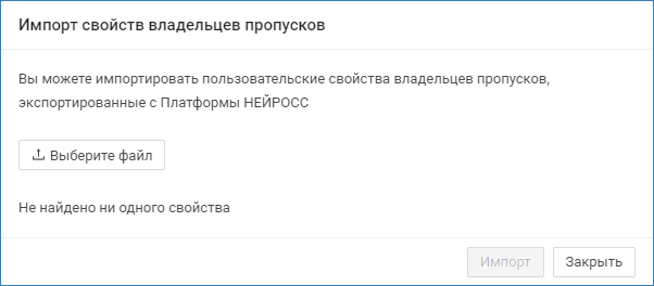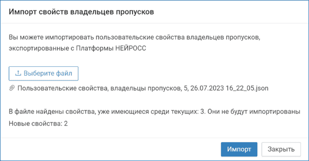 - Для импорта пользовательских свойств владельца пропуска перейдите к вкладке Свойства владельца пропуска. Для импорт пользовательских свойств пропуска перейдите к вкладке Свойства пропуска. Нажмите на кнопку Импорт.