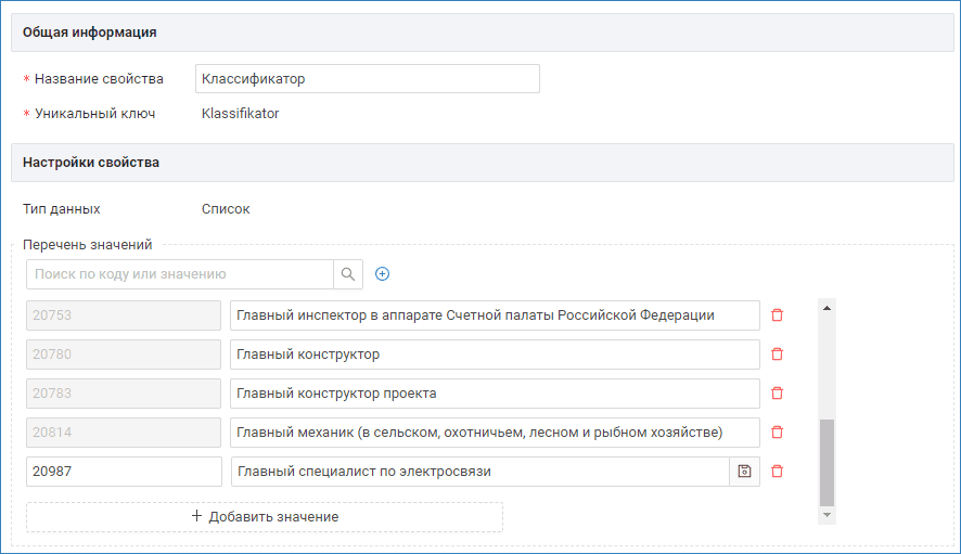 Свойство типа «список» предоставляет классический справочник с уникальным кодом для каждого значения, возможностью добавления и корректировки значений, поиском по коду и значению. Для добавления нового значения в список нажмите на кнопку Добавить значение, задайте код и текст значения, подтвердите завершение ввода нажатием клавиши Enter (Ввод) или кнопки Сохранить . Для удаления значения из справочника нажмите на кнопку Удалить.