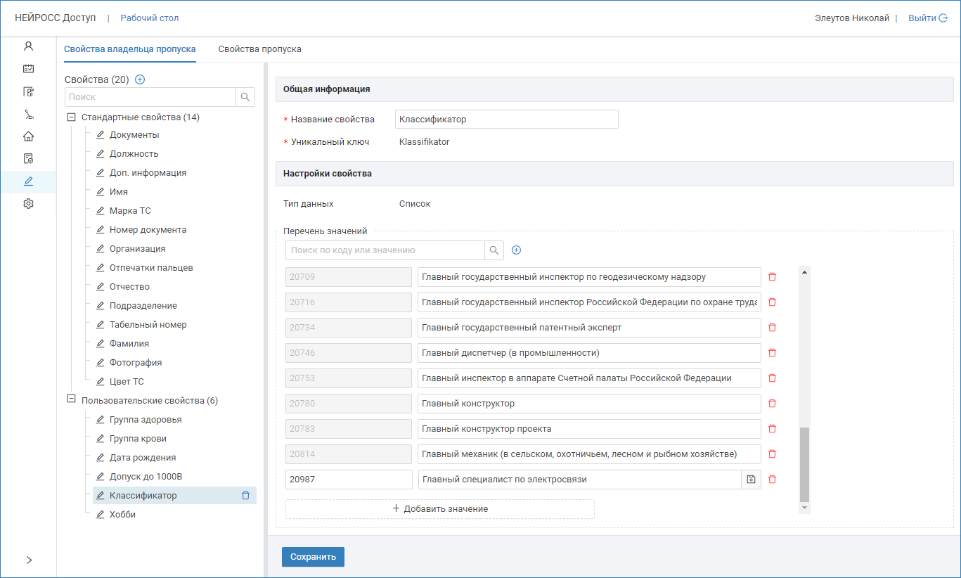 С версии 20.6 Платформы НЕЙРОСС данные владельца и пропуска могут быть дополнены произвольным набором пользовательских свойств следующего типа: текст, логическое поле (Да/Нет), дата, время, дата и время, список. Перечень значений для поля типа «список» настраивается, редактируется и дополняется. Для отображения пользовательских свойств в форме владельца или в форме пропуска предусмотрен простой конструктор форм, вы также можете разработать шаблон формы самостоятельно или заказать такую разработку. Пользовательское свойство также может быть добавлено в таблицу пропусков, при этом обеспечивается сортировка и фильтрация записей по добавленным полям.