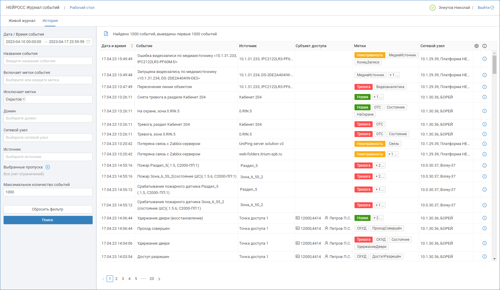 В версии 20,6 Платформы НЕЙРОСС мы полностью переработали интерфейс приложения журнала событий, добавив возможность вывода событий всех узлов сети с функцией фильтрации по домену и по меткам (по принципу включает/исключает), также остались доступны фильтры по названию события, источнику, и выбранным пропускам. Теперь это по настоящему мощный инструмент просмотра событий узлов НЕЙРОСС. Также вы можете отслеживать события ONVIF ip-видеокамер, в том числе, — события встроенной в камеру видеоаналитики. Любую выборку событий вы можете экспортировать в файл формата CSV и превратить в полноценный отчёт, добавив оформление в выбранном вами редакторе.
