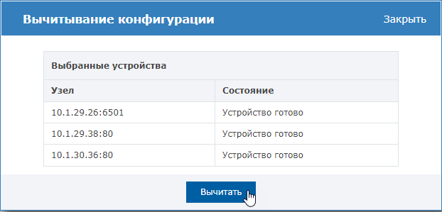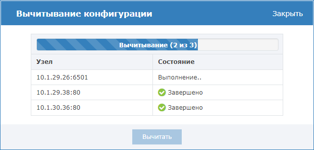 В разделе Сеть в списке узлов сети выберите узел или несколько узлов, с которых нужно вычитать новую конфигурацию, нажмите на кнопку Вычитать конфигурацию.