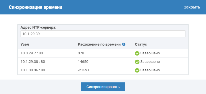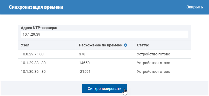 В разделе Сеть в списке узлов сети выберите узел или несколько узлов, для которых нужно задать NTP-сервер, нажмите на кнопку Синхронизация времени. Инструменты фильтрации и выделения приведены в разделе [Сеть].