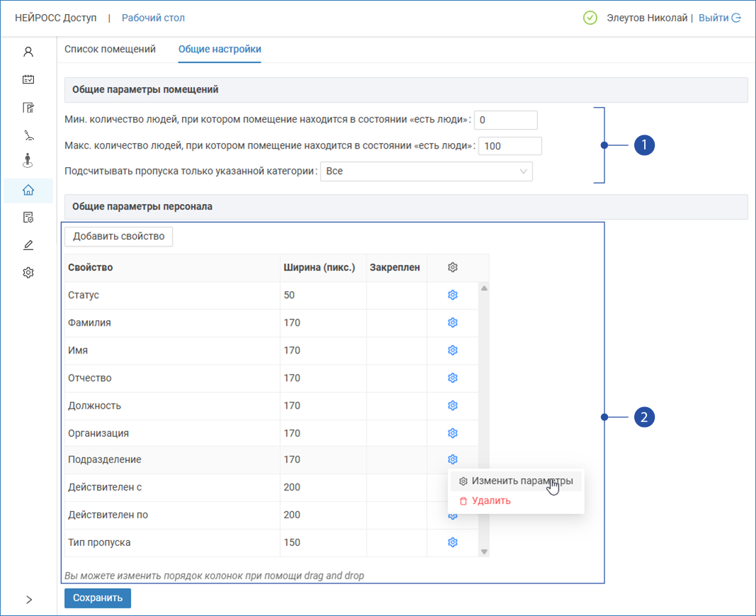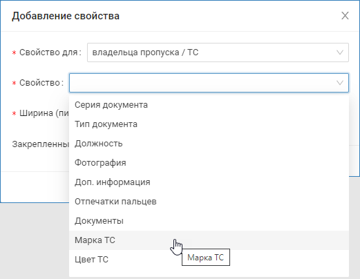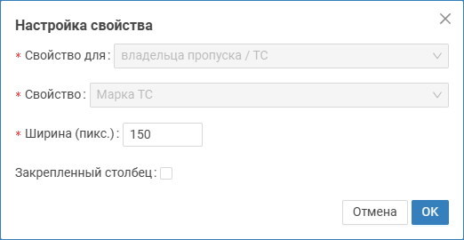 Выберите из раскрывающегося списка требуемое свойство. Если пользовательского свойства нет в списке, проверьте, что оно добавлено в разделе Настройки СКУД [Добавление пользовательских свойств]. Также возможно добавление свойства через его ключ. Будьте внимательны при вводе ключа пользовательского свойства. Ключ является регистрозависимым, заглавные и прописные буквы различаются! Поле доступно, если в поле Свойство задано значение Пользовательское свойство. Определяет внутреннее имя (ключ) пользовательского свойства. Ключ должен быть уникальным. Рекомендуется использовать латинские символы. Закрепление столбцов предназначено для решения проблемы скрытия важных столбцов при горизонтальной прокрутке таблицы пропусков с большим количеством данных. Столбец фиксируется в левой части таблицы и не двигается. Если флаг установлен, поле будет закреплено. Можно закрепить несколько столбцов одновременно. Пример добавления свойства Марка ТС Данный пример добавления пользовательских свойств является рабочим но несколько устаревшим. Гораздо более удобно воспользоваться инструментом добавления пользовательских свойств средствами раздела Настройки СКУД и выбирать эти свойства из раскрывающегося списка наравне со стандартными полями [Добавление пользовательских свойств]. Перенос колонки Новое свойство будет добавлено в конец списка свойств. Чтобы переместить его в другое место: Вы можете отредактировать название и ширину колонки. Нажмите на кнопку , расположенную в строке свойства. Выберите Изменить параметры. Выберите Удалить. Удаление свойства из таблицы не приводит к удалению данных. Вы всегда можете повторно добавить нужное свойство. При работе с «широкими» таблицами пропусков, содержащих большое количество полей данных, удобно закрепить в левой части таблицы некоторые ключевые данные, такие как Фамилия, Имя и статус пропуска, чтобы эти данные не скрывались при горизонтальной прокрутке вправо. Особенно это важно при работе на небольших мониторах. Функция закрепления столбцов таблицы пропусков реализована с версии 20.12 Платформы НЕЙРОСС. Администратор системы выбирает набор полей, который не должен скрываться при прокрутке, и назначает их «закреплёнными». Функция настройки таблицы списка людей в помещении реализована с версии 20.30 Платформы НЕЙРОСС. Чтобы закрепить столбец: Нажмите на кнопку , расположенную в строке свойства. Если кнопка недоступна, переведите таблицу в пользовательский режим настроек. Для этого в блоке Тип таблицы [3] выберите Пользовательская форма. Выберите Изменить параметры. Закрепленный столбец всегда отображается в левой части таблицы. В горизонтальной прокрутке «участвуют» (сдвигаются влево до потери видимости) только столбцы, для которых параметр закрепления не указан. Закреплённые столбцы отделяются от незакреплённых границей в виде тени. Поле Возможные значения Комментарий Свойство для Путём выбора из раскрывающегося списка, укажите, свойством пропуска или владельца является добавляемое поле. Свойство Ключ пользовательского свойства Текст Название колонки Текст Поле доступно, если в поле Свойство задано значение Пользовательское свойство. Для стандартных полей Название всегда совпадает с именем поля.