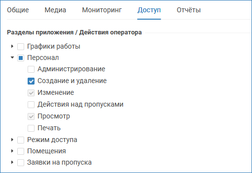 | Добавление и удаление карт | Блок Персонал, право Создание и удаление | Требуется право Создание и удаление раздела Персонал вкладки Доступ. Право Создание и удаление автоматически включает право Изменение. Инструкция по настройке приведена в разделе [Права на управление доступом (АРМ Доступ)]. |