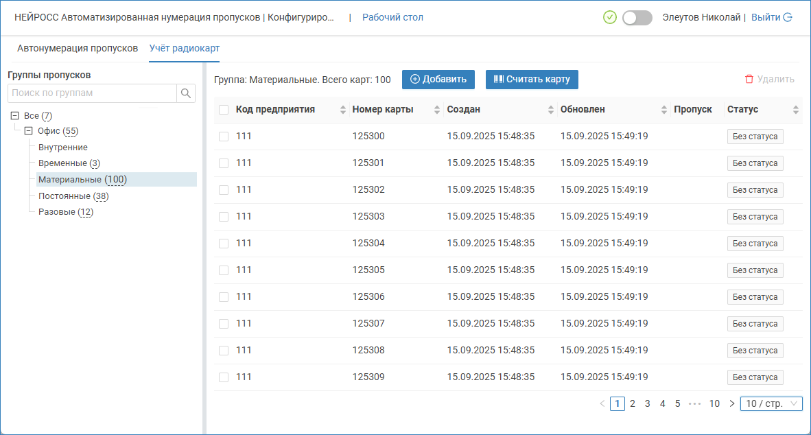 Если в системе уже есть выданные пропуска, то радиокарты по ним будут автоматически добавлены и «привязаны» к пропуску. Статус пропуска установлен в значение «Без статуса».