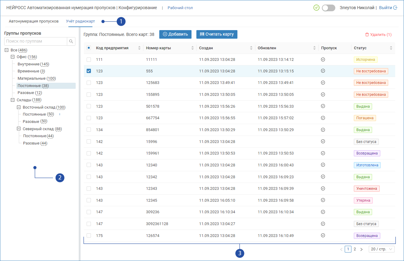 - Вкладка Учёт радиокарт позволяет сформировать пул радиокарт и сопоставить радиокарту пропуску владельца.