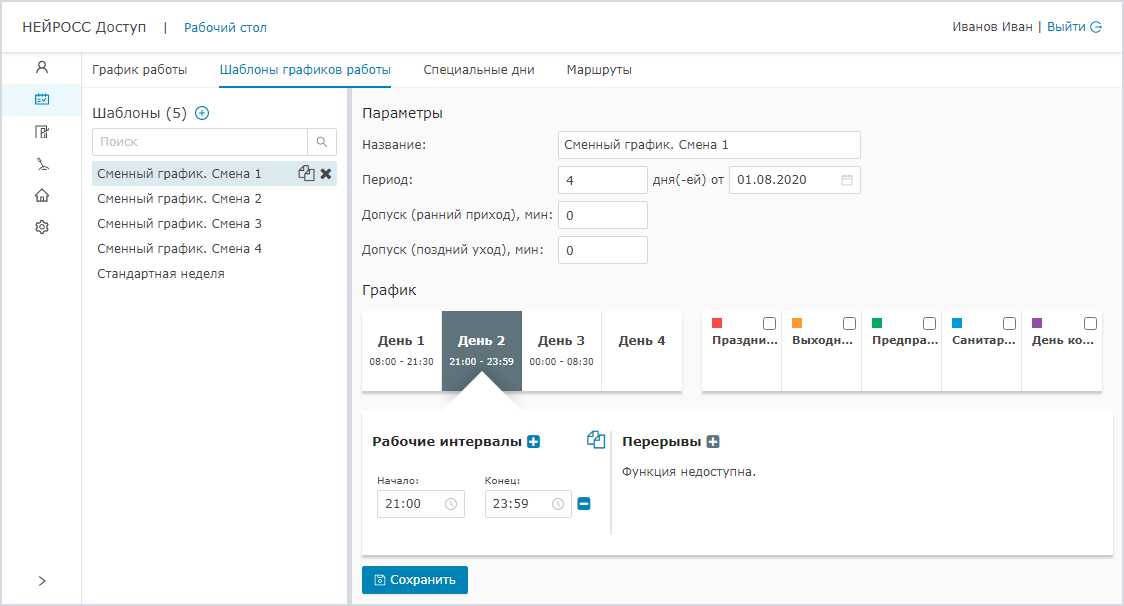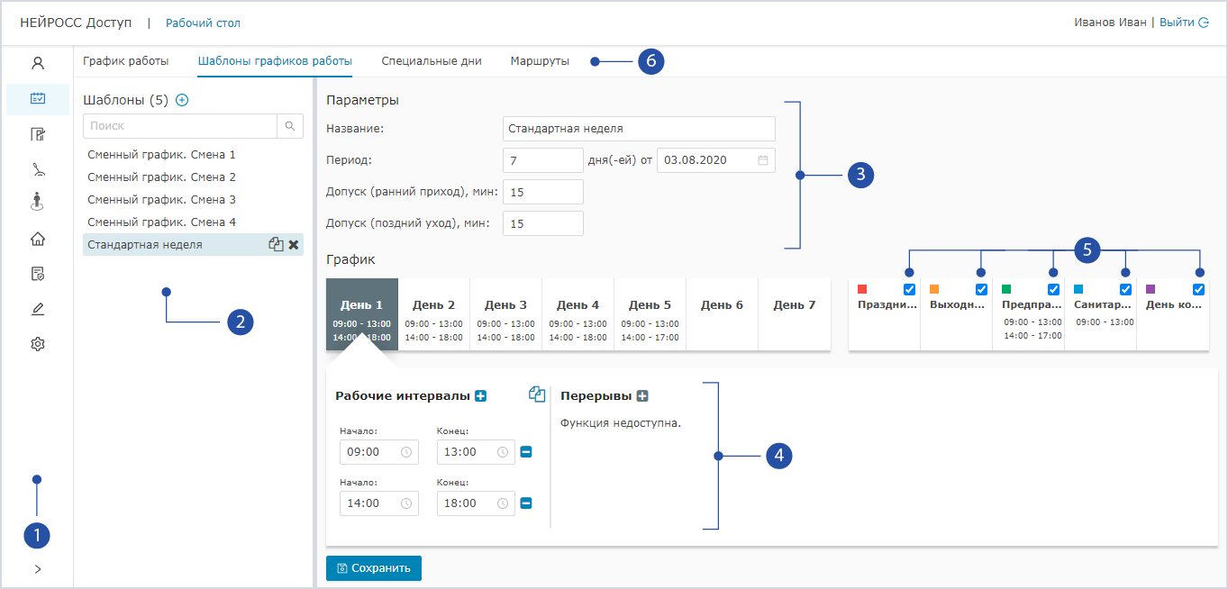- Подразделы: График работы, Шаблоны, Специальные дни, Маршруты.