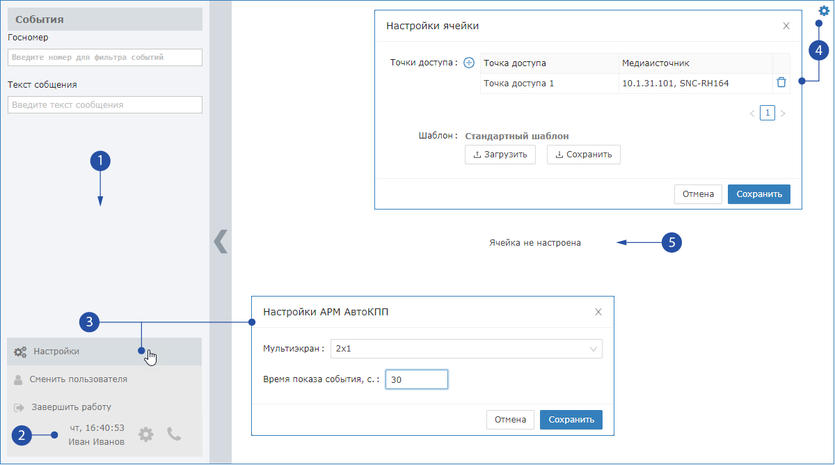 - Настройки ячейки: «привязка» к ячейке точки доступа и медиаисточника для видеоподтверждения событий, задание шаблона ячейки;