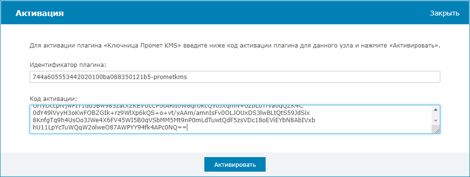 4. В отобразившемся окне активации скопируйте содержимое поля Идентификатор плагина и передайте в компанию-производитель. В ответ вы получите код активации, который нужно вставить в поле ниже. Далее нажмите Активировать. Вы получите сообщение об успешной активации плагина.