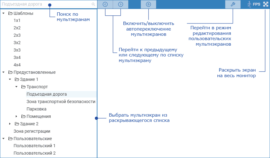 Можно настроить шаблон для одного непрерывно используемого мультиэкрана на каждый монитор. Однако в основном простые мультиэкраны предусмотрены для решения разовых задач, их настройки сбрасываются при переключении на другой мультиэкран или по завершении работы. - Предустановленные (или глобальные) — мультиэкраны, настроенные администратором системы безопасности. Такие мультиэкраны доступны всем операторам АРМ Видео и АРМ Центр, но с учётом ограничений прав.