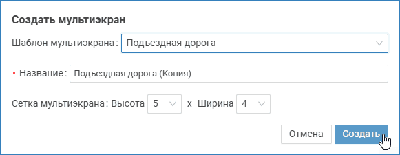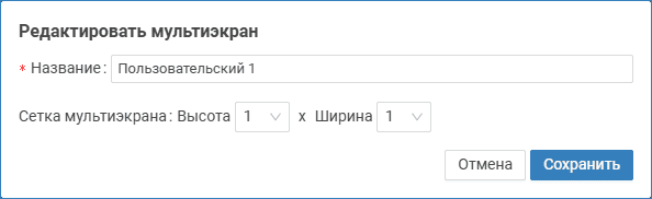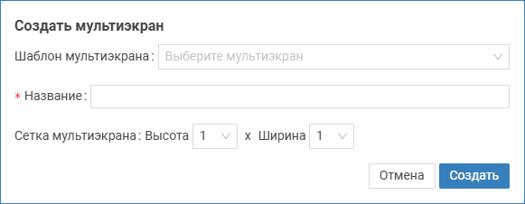 | Шаблон мультиэкрана | Вы можете создать мультиэкран на основе одного из предустановленных. Для этого в поле Шаблон мультиэкрана выберите из раскрывающегося списка мультиэкран, который будет взят в качестве основы. При этом автоматически будут заполнены поля Название и Сетка мультиэкранов. |