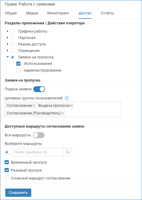 Значение в данном поле не ограничивает права на управление маршрутами или аудит заявок, а распространяется только на подачу и обработку заявок.