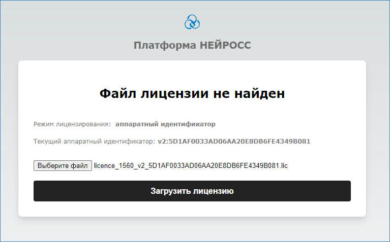 Лицензирование Платформы НЕЙРОСС осуществляется по одному трех признаков: по USB-ключу, сетевому ключу или аппаратному идентификатору [Лицензирование | Платформа НЕЙРОСС]. При старте и в процессе работы Платформа НЕЙРОСС проверяет наличие файл лицензии. При его отсутствии возникает ошибка «Файл лицензии не найден».