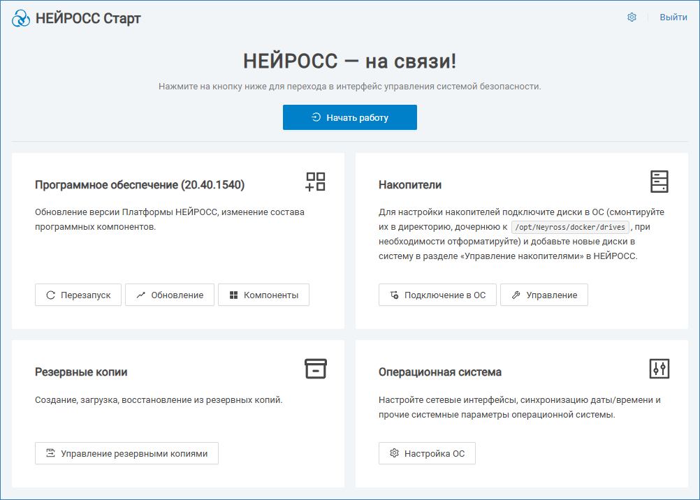 | Обновление НЕЙРОСС Старт | Обновление НЕЙРОСС Старт возможно путем повторной установки, либо средствами веб-интерфейса. |