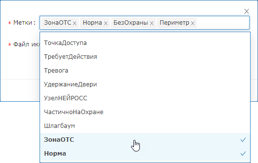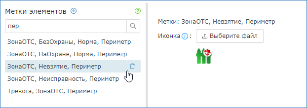 С помощью редактора иконок вы можете переопределить вид иконок для произвольных наборов меток. Возможно использовать метки типов элементов, метки состояний элементов, меток состояний компонентов (дверей, замков) [Перечень меток], а также произвольные пользовательские метки.