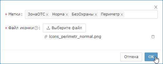 - Иконка текущего набора меток: превью изображения из файла, назначенного выбранному в списке [1] набору меток. Чтобы изменить иконку, достаточно указать путь к файлу изображения. На скриншоте выше стандартная иконка для набора: ЗонаОТС, Норма заменена пользовательской , можно выполнить сброс к значению по умолчанию: сбросить иконку.
