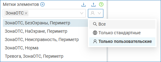 Поле поиска: позволяет легко отфильтровать наборы меток (на скриншоте выше метки отобраны по слову «зона»)/