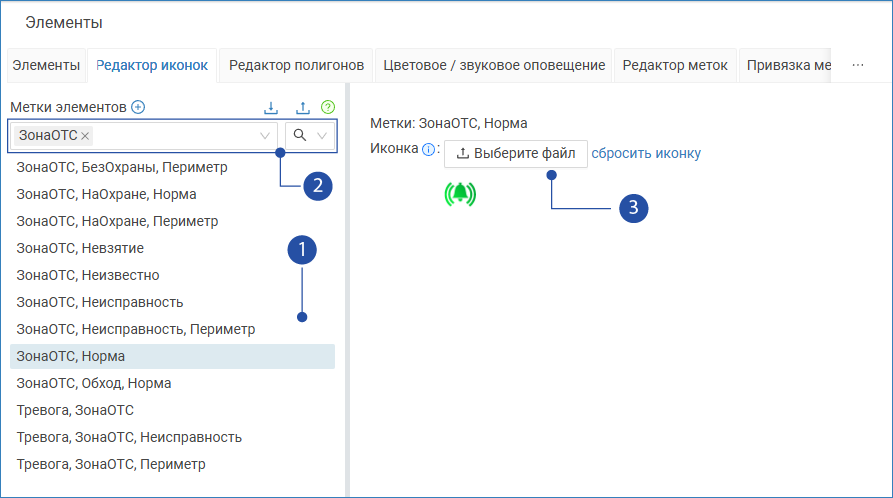 - На вкладке Редактор иконок выберите в списке наборов меток [1] требуемый набор.