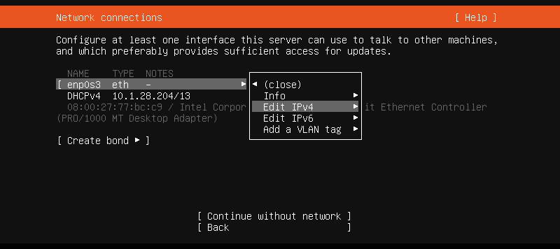 enp0s3. Сетевые интерфейсы могут иметь и другие имена.:eth0илиeno1, или дажеenx78e7d1ea46da. Нажмите на клавишу Enter для настройки выбранного интерфейса.- В отобразившемся окне c помощью стрелок Вверх и Вниз клавиатуры выберите пункт Edit IPv4. Нажмите Enter.