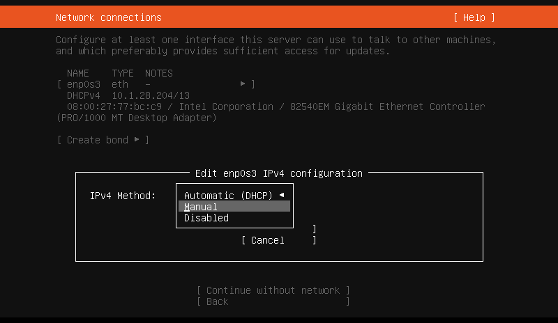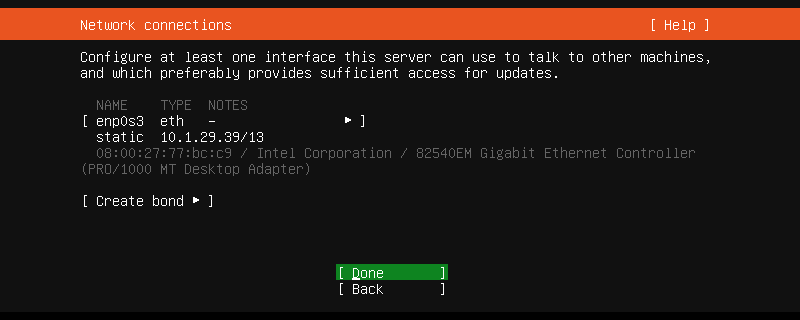 Вы также можете пропустить данный шаг, выбрав Continue without network и задать параметры сети позже с помощью netplan [Настройка сетевых параметров].С помощью клавиши TAB Выберите требуемый сетевой интерфейс. В нашем примере это