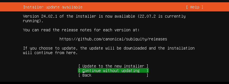 - Не обновляете инсталлятор. Выберите Continue without updating. Нажмите на клавишу Enter.
